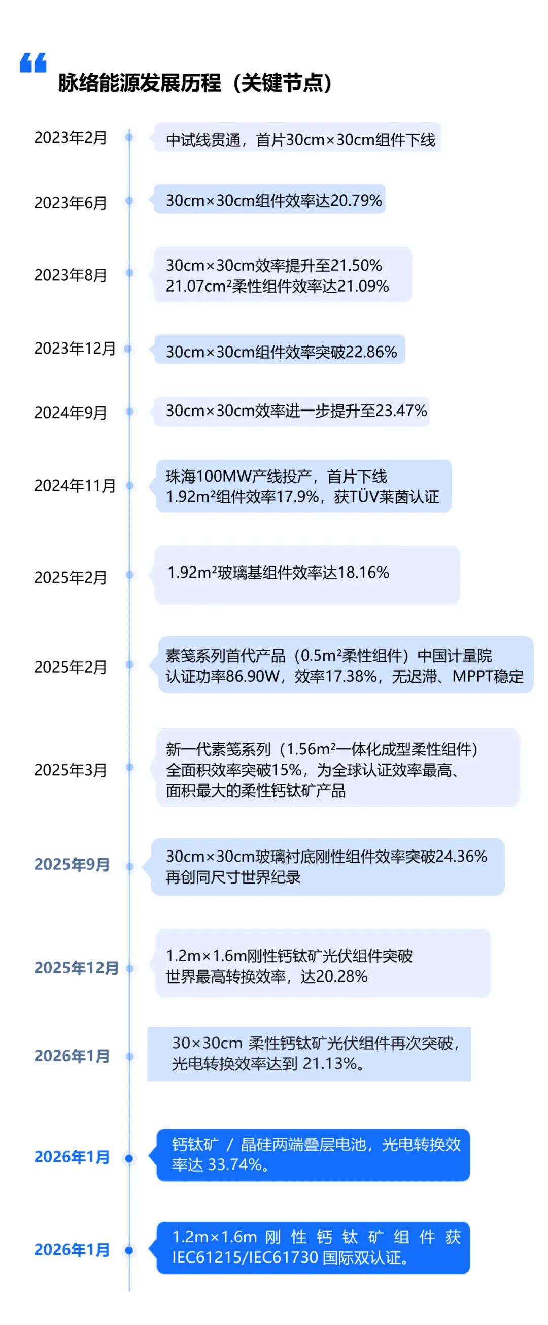 与此同时,脉络能源也在加速柔性钙钛矿光伏组件的场景导入与实证验证,此前已获得IEC TS 63163:2021 应用类产品认证以及RoHS 认证;现正面向消费电子、移动能源、车载光伏、航空航天及卫星等多元应用方向持续推进,促进柔性钙钛矿组件的规模化应用与商业化落地。面向未来,公司将持续围绕基础研发、稳效协同、应用拓展等方面持续迭代优化,加速钙钛矿技术走向更广阔的市场。
