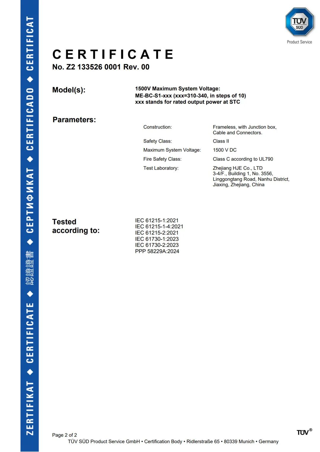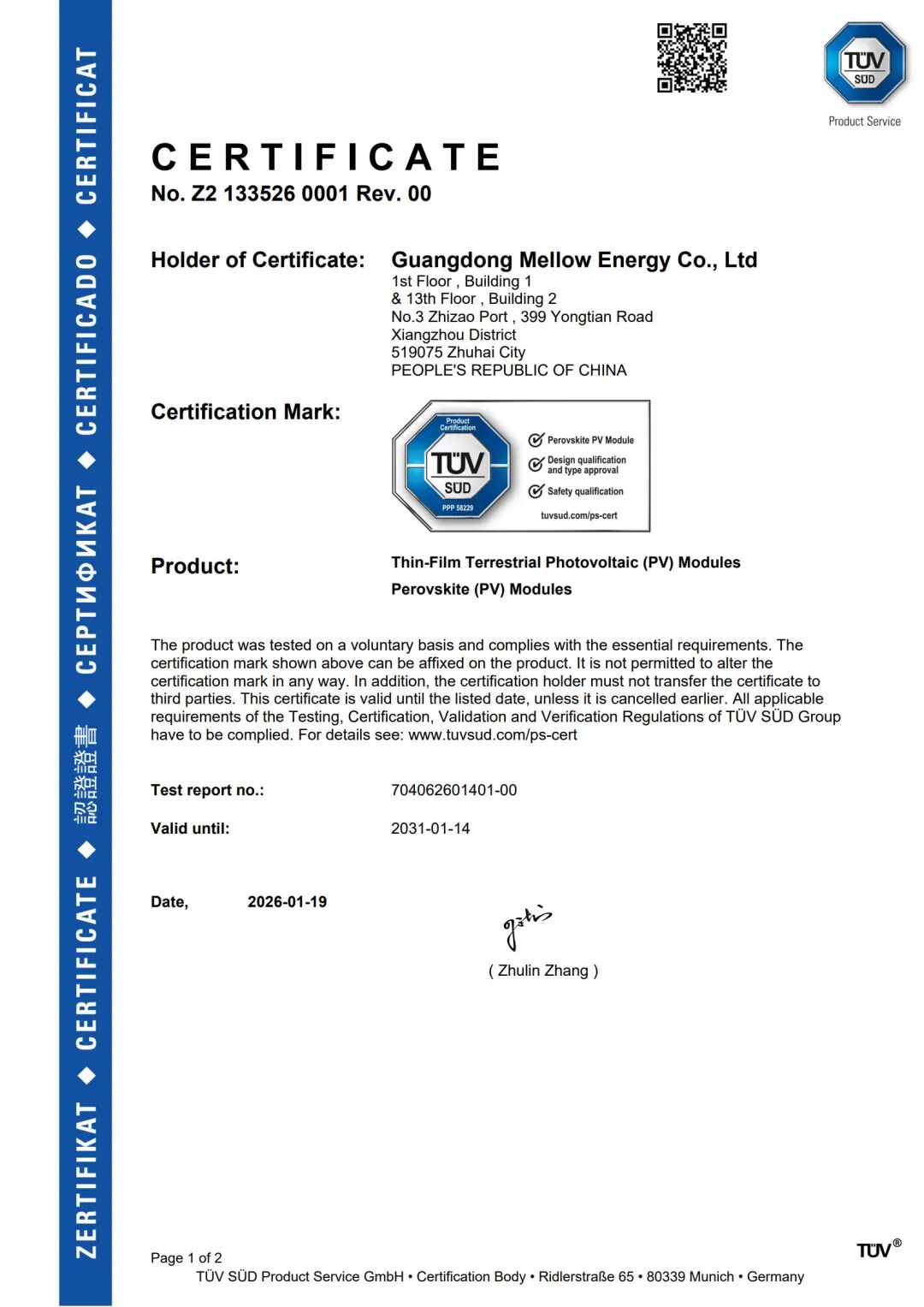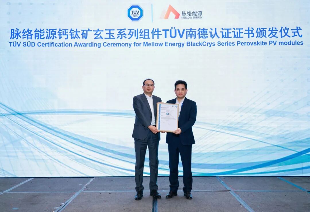 近日,脉络能源2平方米级钙钛矿刚性组件顺利通过TÜV南德(TÜV SÜD)测试评估,正式获得IEC61215(性能可靠性)与IEC61730(安全规范)国际双认证。该认证的取得,标志着公司刚性钙钛矿组件在长期可靠性与安全性能方面达到国际光伏产品准入要求,为后续规模化应用与市场导入奠定坚实基础。