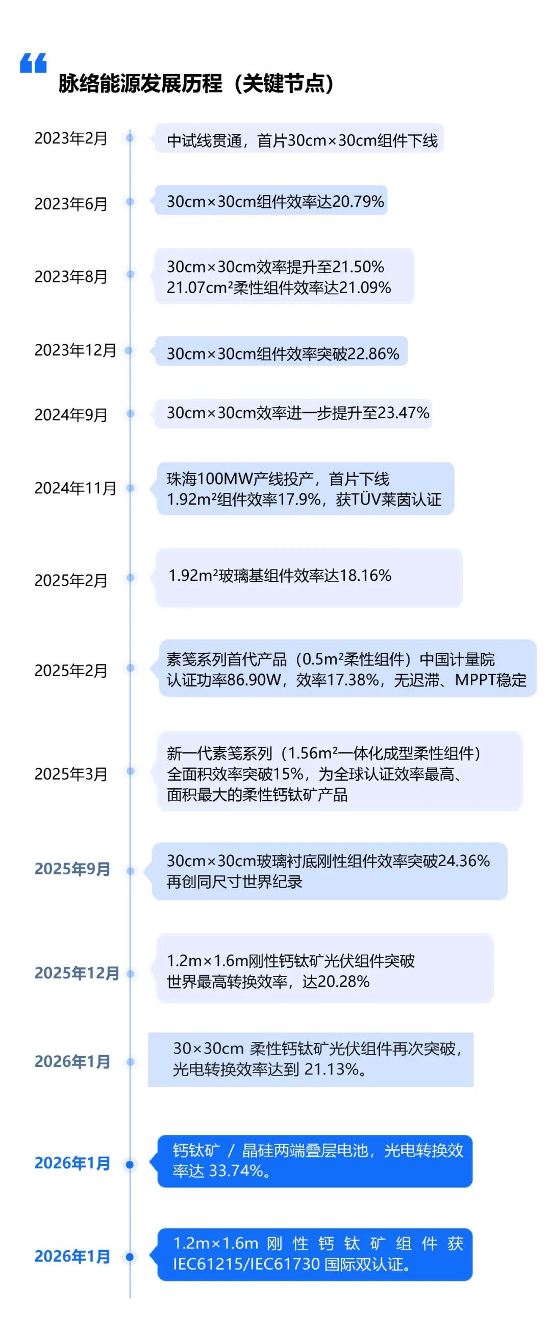 基于在30cm×30cm钙钛矿组件的技术积累,脉络能源2平方米级钙钛矿刚性组件近期同时在转化效率和稳定性上通过TÜV 南德权威认证:组件全面积认证效率达20.28%,突破2平方米级钙钛矿组件世界最高转换效率;与此同时,该系列组件产品也获得了IEC61215和IEC61730的稳定性和安全性的国际双认证,标志着公司刚性钙钛矿组件在长期可靠性与安全性能方面达到国际光伏产品准入要求,为后续规模化应用与市场导入奠定坚实基础。