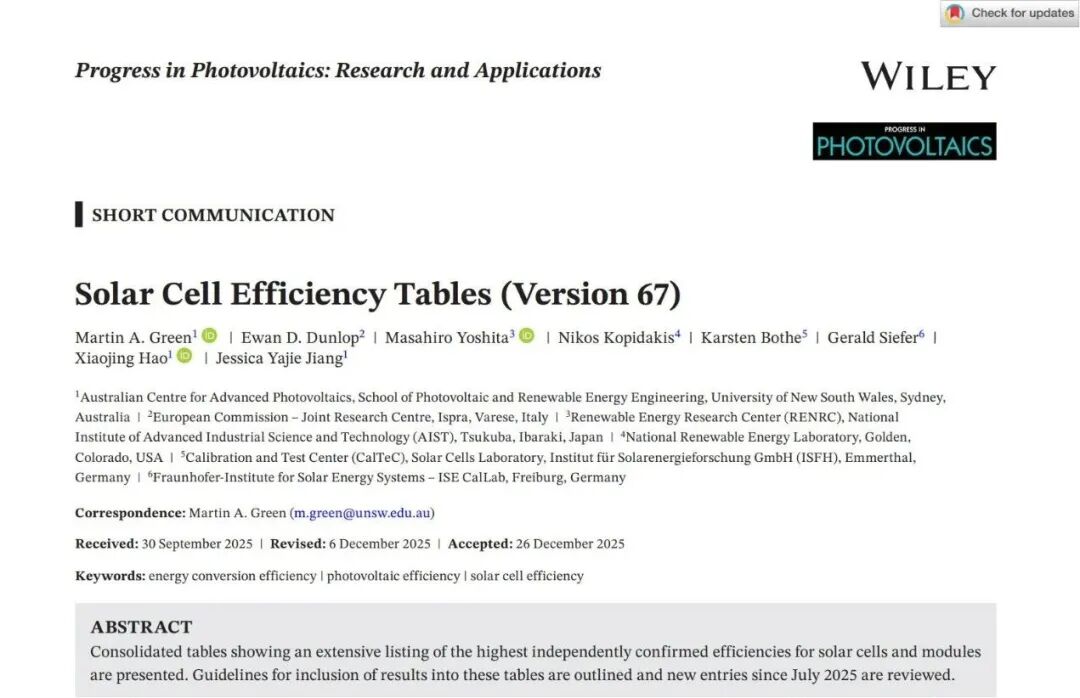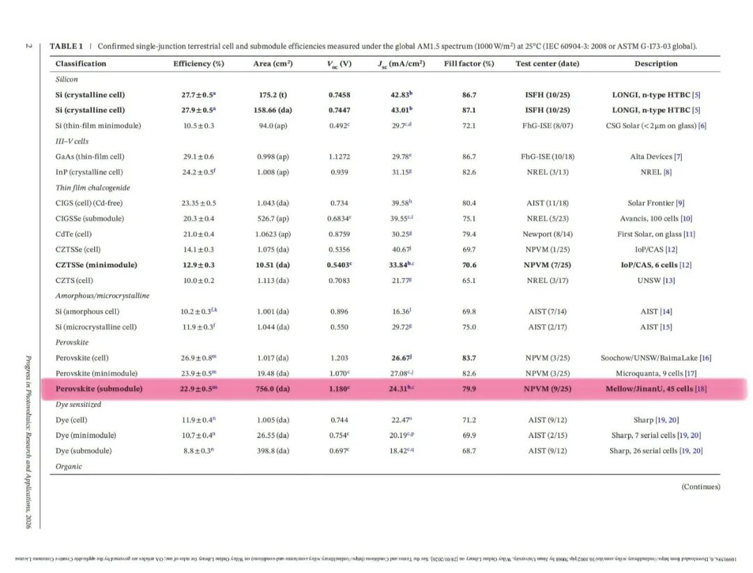 Progress in Photovoltaics《太阳电池效率表》是全球光伏领域最权威的电池效率排名之一,该榜单持续追踪并独立验证全球各类太阳能电池技术的最高效率,为整个行业提供了技术进步与可靠性的终极标尺,其收录成绩备受学术界与产业界认可。