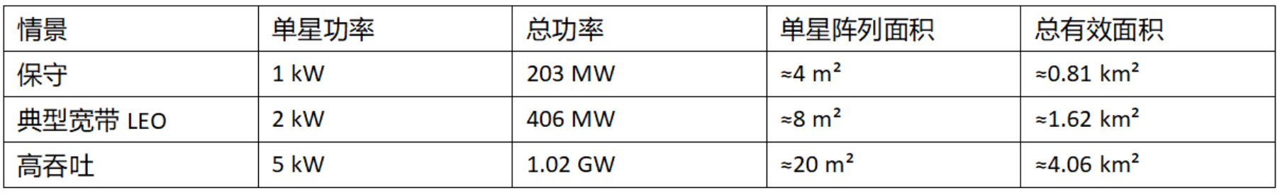 【一张表看懂:20.3万颗卫星的光伏量级(等效功率密度按250 W/m²)】
