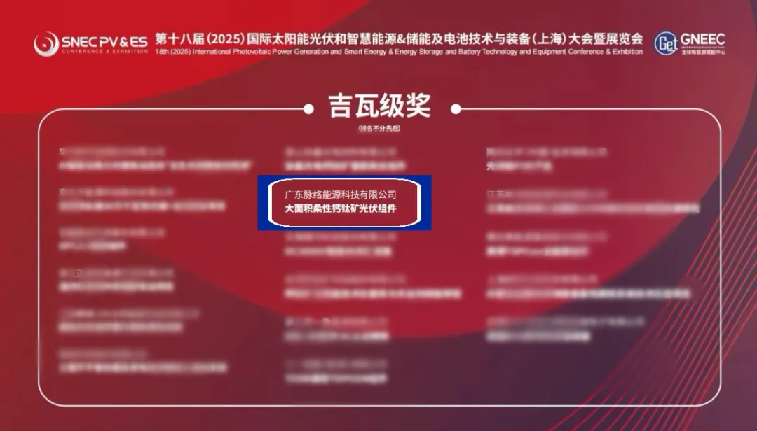 展会期间,脉络能源传来喜讯——在光伏技术创新的赛道上,脉络能源再获权威认可!凭借前沿的科研成果与不懈的技术攻坚,脉络能源成功通过国际知名第三方检测认证机构 TÜV 莱茵,正式颁发钙钛矿 IEC TS 63163:2021 应用类产品认证证书。同时,脉络能源还斩获了亚洲光伏产业协会(APVIA)科技成就奖、十大亮点评选活动吉瓦级奖,为此次参加SNEC盛会画上完美句号。