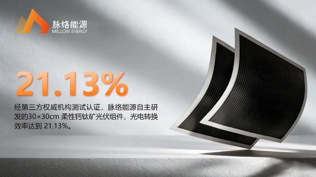 近日,广东脉络能源科技有限公司自主研发的 30×30 cm² 柔性钙钛矿光伏组件,经第三方权威机构TÜV北德认证,组件光电转换效率达 21.13%,为同面积级别柔性钙钛矿光伏组件世界最高转换效率。 此次,脉络能源在30×30cm² 规格的柔性钙钛矿组件上,实现了经第三方权威机构 TÜV 北德认证的21.13% 光电转换效率。进一步验证脉络能源的技术水平处于国际同类技术先进行列,彰显了公司在柔性钙钛矿组件工程化与产品化领域的持续推进能力。围绕柔性钙钛矿光伏组件的应用场景拓展,脉络能源正加快在消费电子、移动能源、车载光伏、航空航天及卫星等多个领域的实证验证与场景导入工作,推动技术成果从性能指标突破向规模化应用及商业化落地稳步转化。 脉络能源的每一次效率突破,都是行业的前行坐标,以硬核实力刷新性能上限,推动产业向更高效、更可持续的方向进阶。以下是脉络能源效率突破关键节点: 随着组件效率与稳定性的不断提升,柔性钙钛矿光伏在现实应用场景中的可行性与可靠性基础正持续夯实,为后续商业化应用提供了关键技术支撑。 业务进展与合作邀请: 目前,脉络能源主要生产柔性组件与弱光场景组件销售业务。我们诚挚邀请产业链伙伴、行业客户与战略投资者携手合作,共同推进钙钛矿光伏技术的规模化应用。如有意向,欢迎联系销售负责人延总(邮箱:sales@mellow-energy.cn),共谋发展,共赢未来。